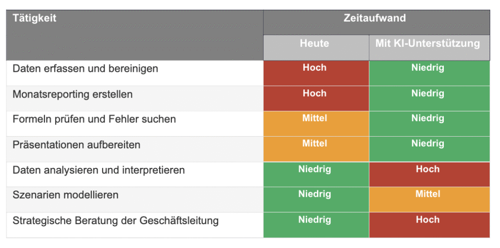 Die Automatisierung durch KI-Tools verschiebt den Schwerpunkt der Arbeit in Finanzabteilungen grundlegend, und zwar weg von operativer Routine hin zu Analyse, Interpretation und strategischer Beratung. Die folgende Tabelle zeigt anschaulich, wie sich der Zeitaufwand für unterschiedliche Tätigkeiten verändert: