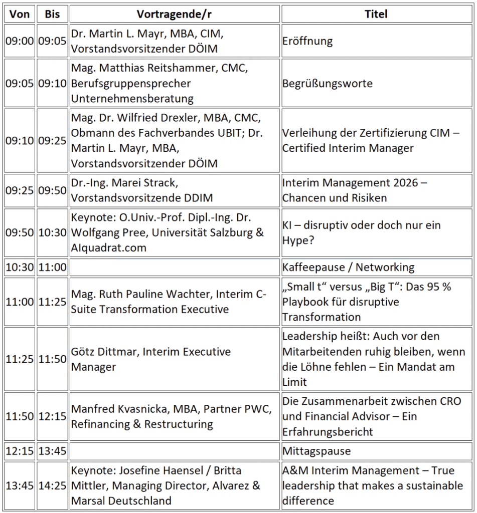 Organisiert wird die KIM von der DÖIM – Dachorganisation Österreichisches Interim Management, der unabhängigen Interessenvertretung der Branche in Österreich. Ziel der DÖIM ist es, Qualität, Sichtbarkeit und Professionalisierung des Interim Managements nachhaltig zu fördern.