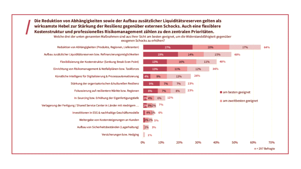 Auf die Frage, welche drei Maßnahmen am besten geeignet sind, die Widerstandsfähigkeit gegenüber externen Schocks zu erhöhen, werden am häufigsten genannt: (1) Reduktion von Abhängigkeiten¹, (2) Aufbau zusätzlicher Reserven und (3) Flexibilisierung der Kostenstruktur.