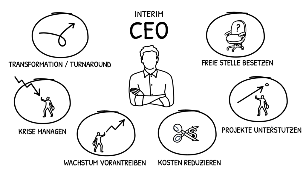 Ein Interims-CEO ist eine sichere und kosteneffiziente Wahl, wenn das Unternehmen vor einer Wachstumsphase oder einem Turnaround steht oder wenn Sie eine freie Stelle besetzen müssen. Ein Interim-CEO kann auch das bestehende Management bei einem bestimmten Projekt unterstützen. Ein Interim CEO unterstützt kurzfristig bei einem Projekt oder einer bestimmten Aufgabe mit Fokus auf den konkreten Auftrag. Der Einsatz ist bei Veränderungen wie beispielsweise Strategieprojekten von unschätzbarem Wert.