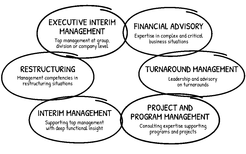 Our services are divided into six groups: Restructuring, Executive Interim Management, Interim Management, Financial Advisory, Turnaround Management and Program & Project Management.